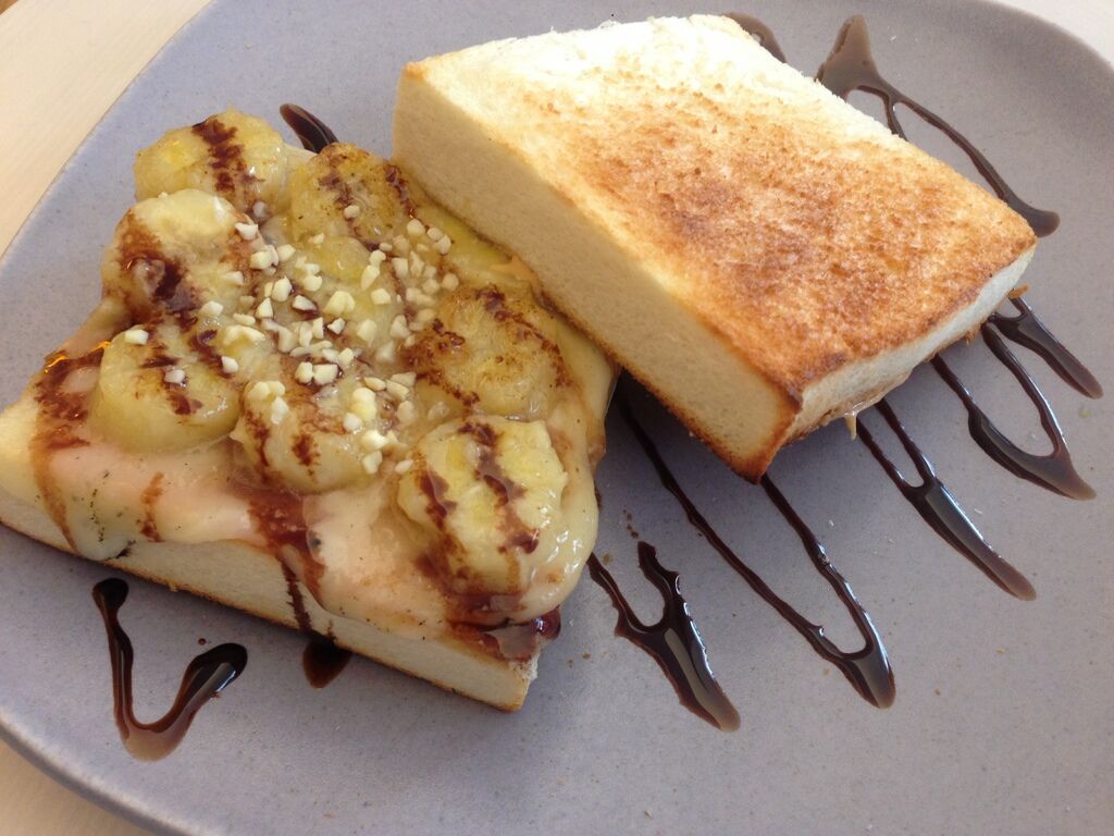 香蕉星球吐司:烤到酥脆的厚片土司放上起司跟香蕉,加熱到溶化後灑上杏仁顆粒跟巧克力醬;香蕉跟巧克力就是絕配,香蕉原本就有甜味,巧克力的量抓得很好,搭起來不會甜到發膩,加上起司讓口感變得滑順,不過兩片厚片吐司實在是太厚啦,只能分開來吃。