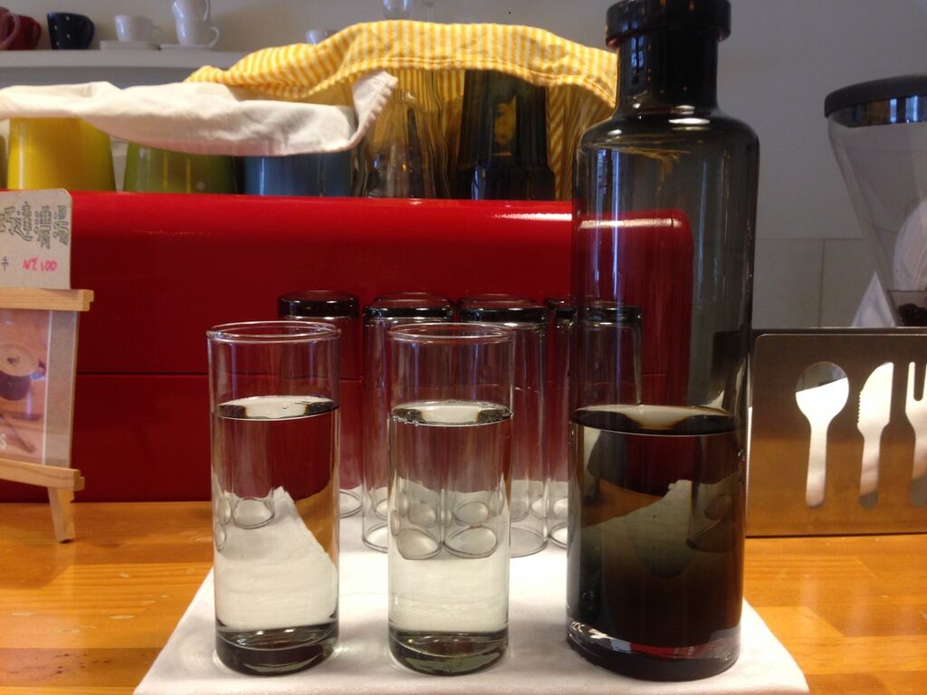 水在櫃台要自己倒,水的味道有點悶悶的,或許加片薄荷葉更好。