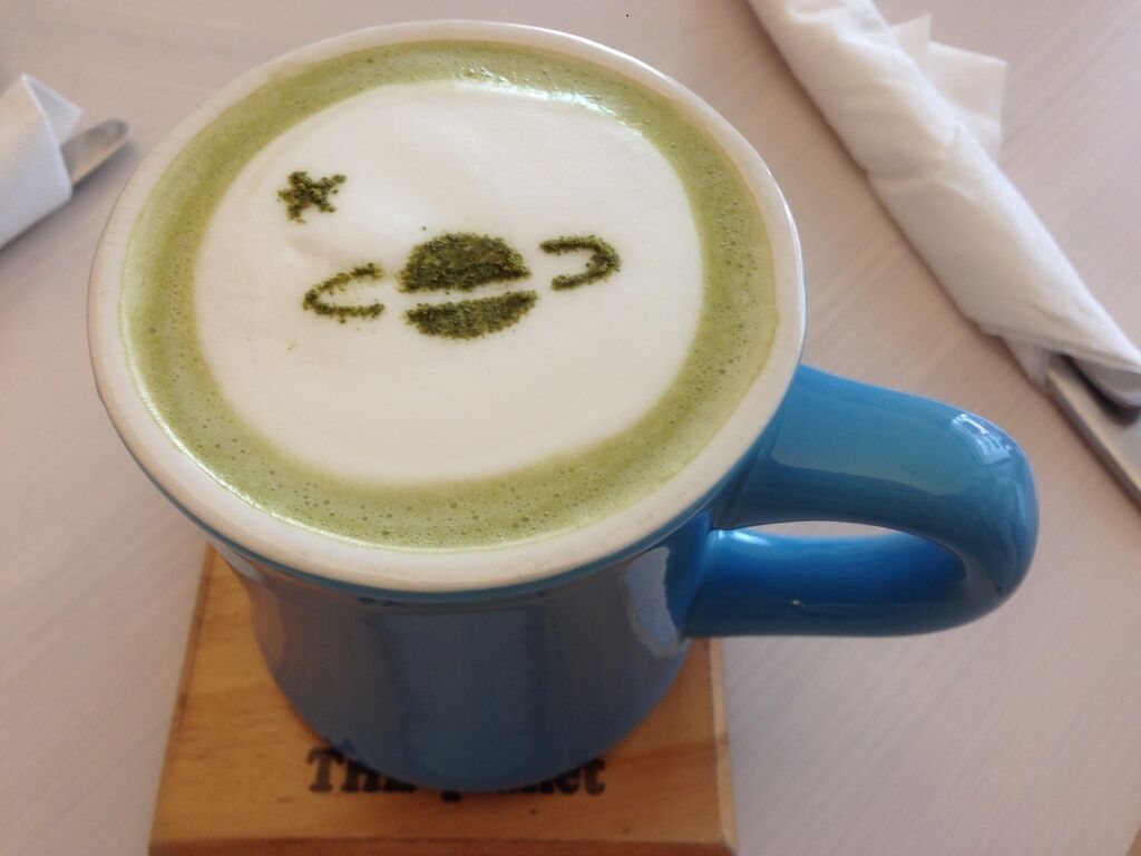 靜岡抹茶鮮奶:奶泡上撒了星球的圖案還有一顆小星星,味道剛想像中的有落差,實在有點淡...不管奶味還是抹茶味都是。
