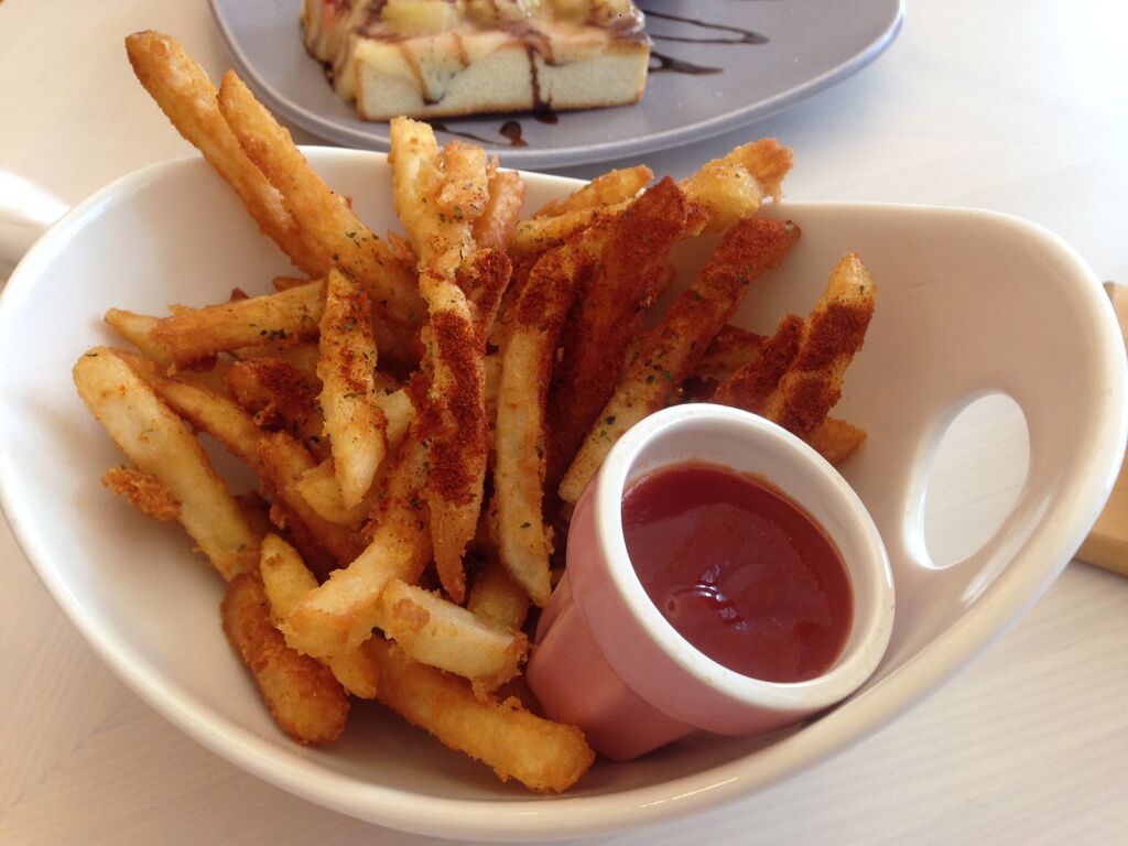 美式脆薯:份量頗大一晚,薯條裹了粉炸外皮超級酥脆,上頭撒了海苔跟紅色的粉,吃不太出來是什麼,這道我很愛,就算冷了也好吃。