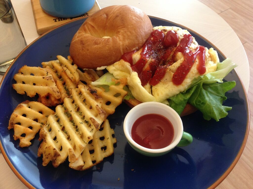 蘑菇蛋捲貝果:一樣份量驚人,貝果外Q內軟好吃,蘑菇蛋包非常鬆軟,即使前面吃了一輪還是忍不住把這道吃光光。