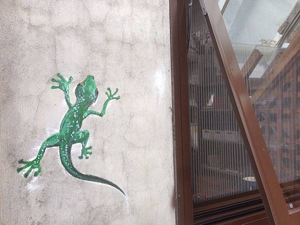 窗邊攀著一隻綠色蜥蜴很俏皮,