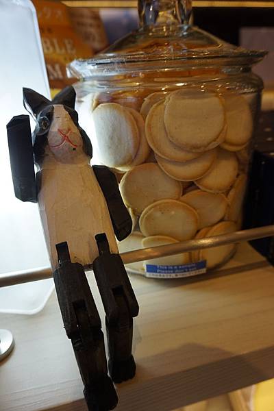 黑白兔旁放了一整罐的起司夾心餅乾,