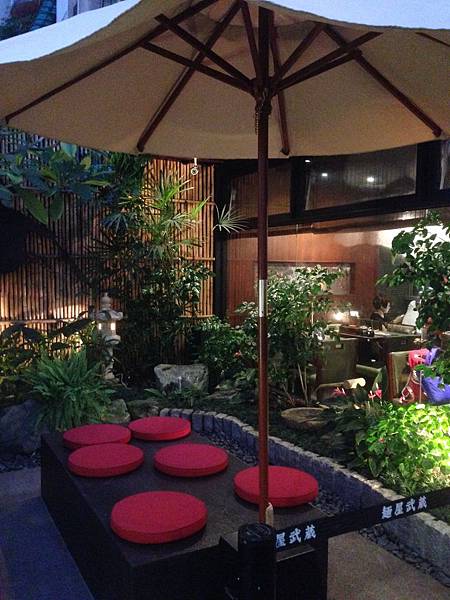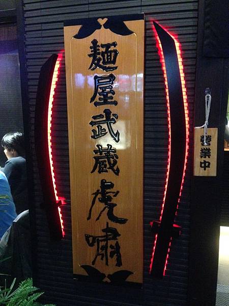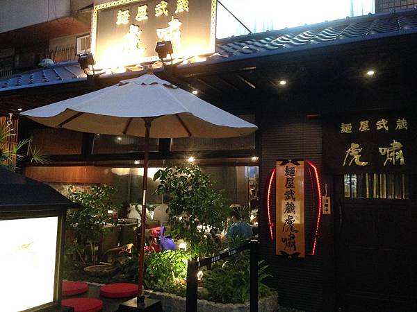 平日下雨的晚上,外頭候位區無人等待,光看倒是蠻有意境的,還有圓圓小坐墊。門口掛著虎嘯的招牌,兩旁還有閃著紅光的雙刀非常有氣勢。