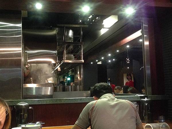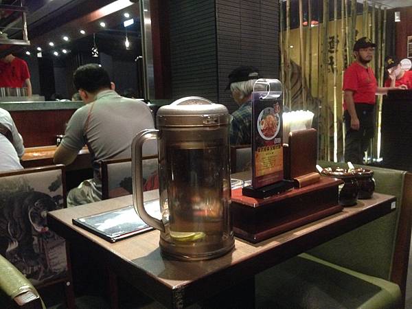 座位很窄不太好走動,廚房是開放式的吧檯可以直接看到作業流程。桌上放了一大壺檸檬水,虎嘯的湯頭口味偏重,還好有檸檬水才不至於膩到吃不完。