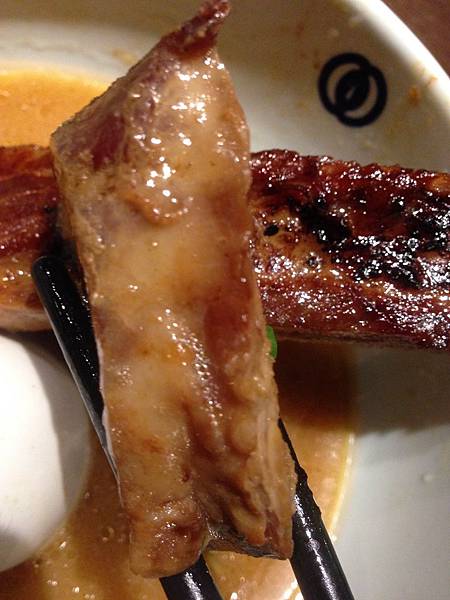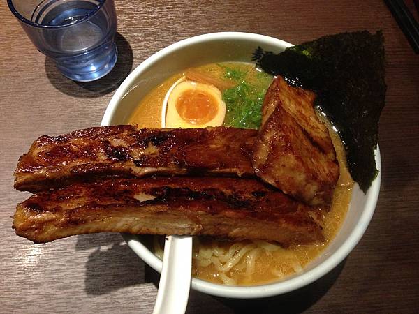 鏘鏘鏘~拉麵上桌啦~完全就是肉的天下,兩隻長長的豬肋排、一塊超厚的炙燒超燒,光看到這畫面我就覺得飽了...