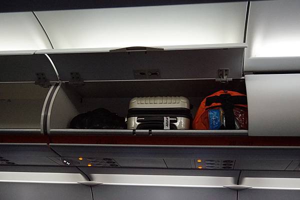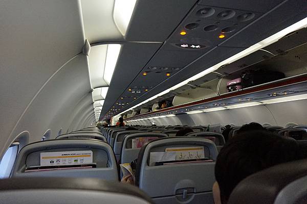 機艙座位左右各三排,剩下中間走道僅供一人行走,放行李的置物艙塞3個登機箱剛剛好,回程時被後一排的旅客用免稅商品占滿應有的位置超不爽的!!!