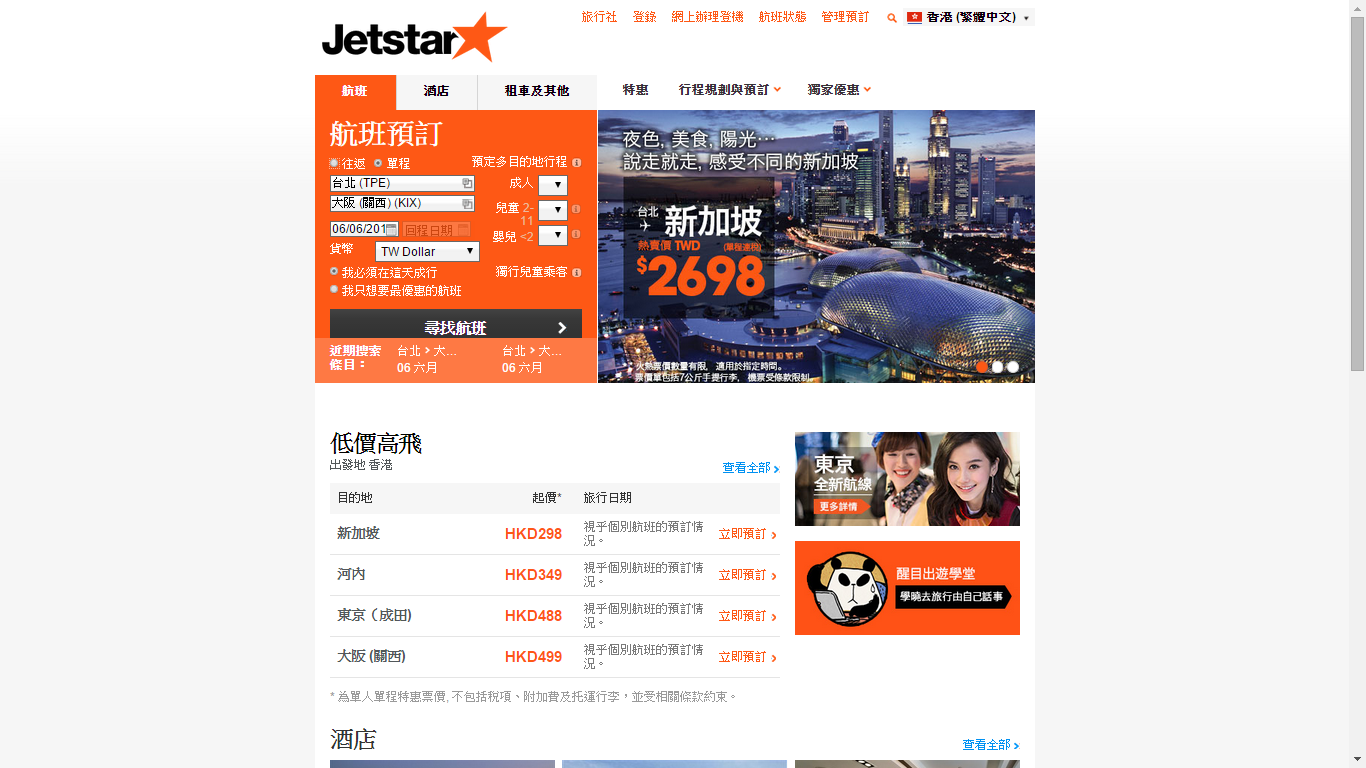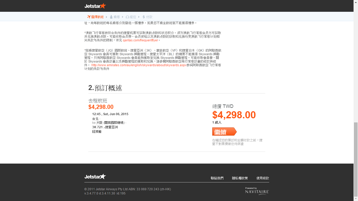 進入捷星的網站,先從左上方橘色方塊的「航班預定」開始,捷星票價依出發地的幣別計價,跟官網沒有關係喔~去程跟回程分開訂,回程以日幣計價(含稅)價差可以到1、2千元,四月中 出發時的匯率還在0.265,現在掉到0.25又更便宜了。