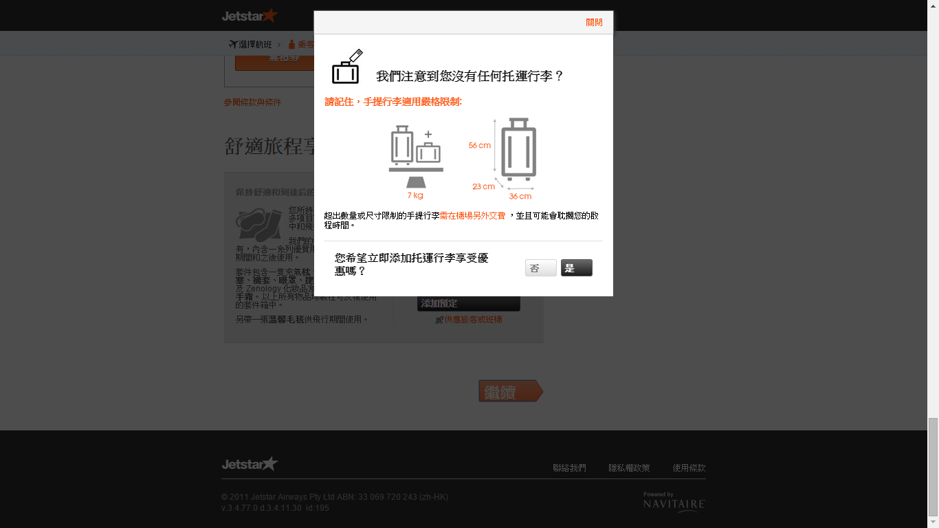 「行李」在未選擇的情況下預設20kg,去程的行李不多沒有另外加購,回程買了25kg。不過廉航對手提行李的限制越來越嚴格了,2014年5月5日起,經濟艙乘客可攜帶一個大件和一個小件手提行李,總重量不可超過 7 公斤,且行李箱大小不可超過22吋(高)*14吋(寬)*9吋(厚)(55.88公分*35.56公分*22.86公分),日前國際航工運輸協會公布新的手提行李的最佳指導性尺寸21.5吋(高)*13.5吋(寬)*7.5吋(厚)(54.61公分*34.29 公分*19.05公分),雖未強制規定實施,但縮小登機箱勢必是未來的趨勢。