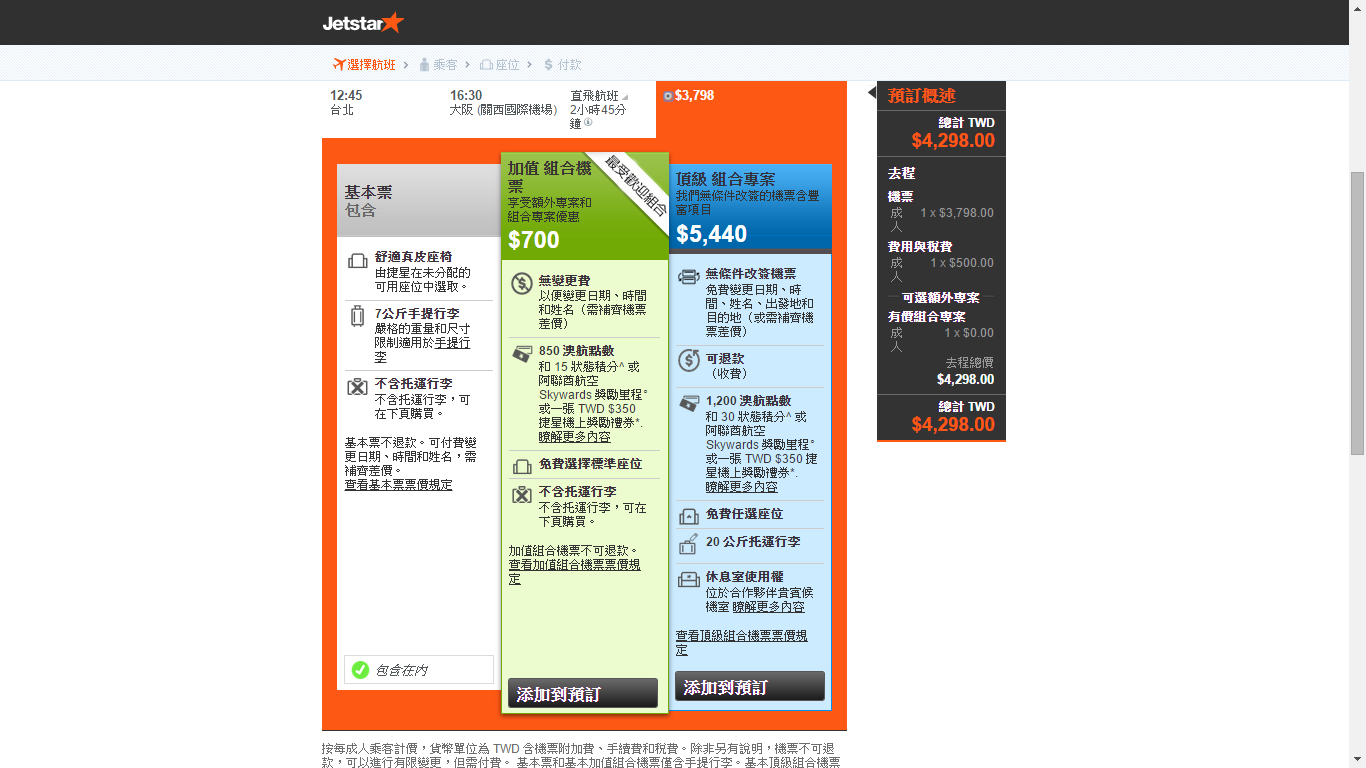 從這一步驟開始,右側會持續跳出黑色框框告訴你目前票價,原本在頁面看到3798元的機票,在黑框裡還要再加上機場稅500元,以及其他選配的項目才是最後的價格。確定後將頁面拉到最下面,會再提醒一次班機日期、時間、起訖點、總價,接著就往下一步驟囉。