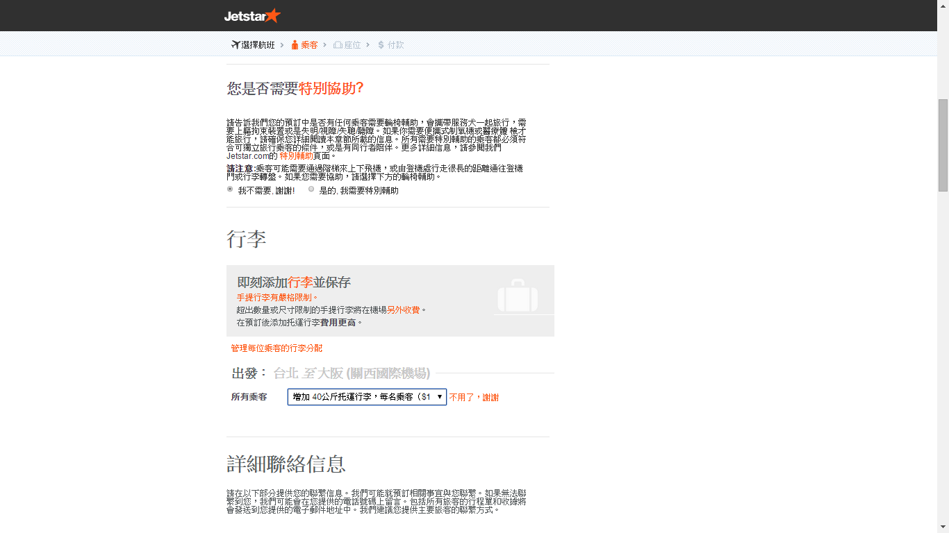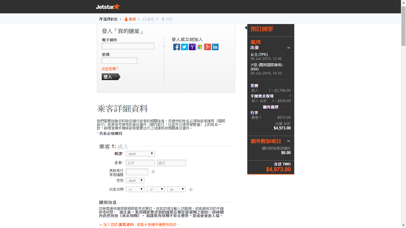 如果有加入捷星會員,登入後會直接輸入已經儲存的會員資料,如果沒有的要另外輸入「乘客資料」。除了基本資料外,下排可選擇是否要填寫「護照資料」,護照資料填寫與否並不會影響機票預訂,不過之後要web check-in時就不用再登打一次。
