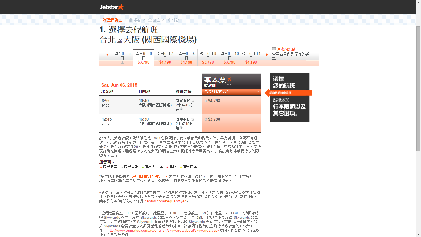 確認日期跟地點,接下來「選擇航班」,網頁會列出一整個禮拜的票價,時間較彈性的旅客可挑票價相對較低的日期出發,早去的航班票價比較高,這就是用金錢換取時間啦,不過有老人或小孩同行的旅客就要考慮是不是能這麼奔波了。一般而言要在起飛前的兩個小時至機場辦理報到及登機,0655的飛機看似很漂亮的時間,但這表示早上5點就要到機場,機場的接駁也要列入考慮。