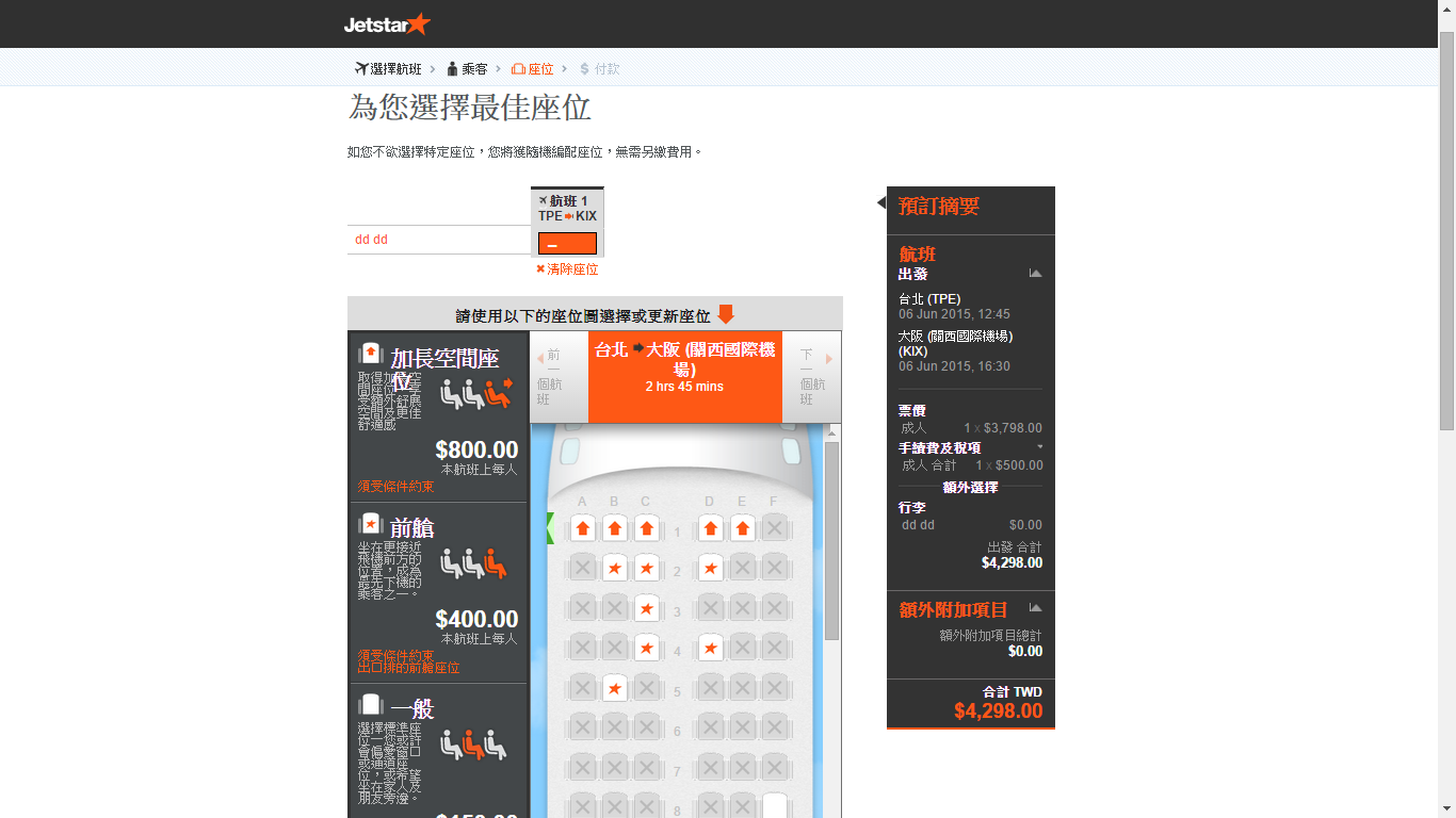 座位也要double check,最前排空間最大要800元,前2-5排的旅客可優先下飛機也要加400元。