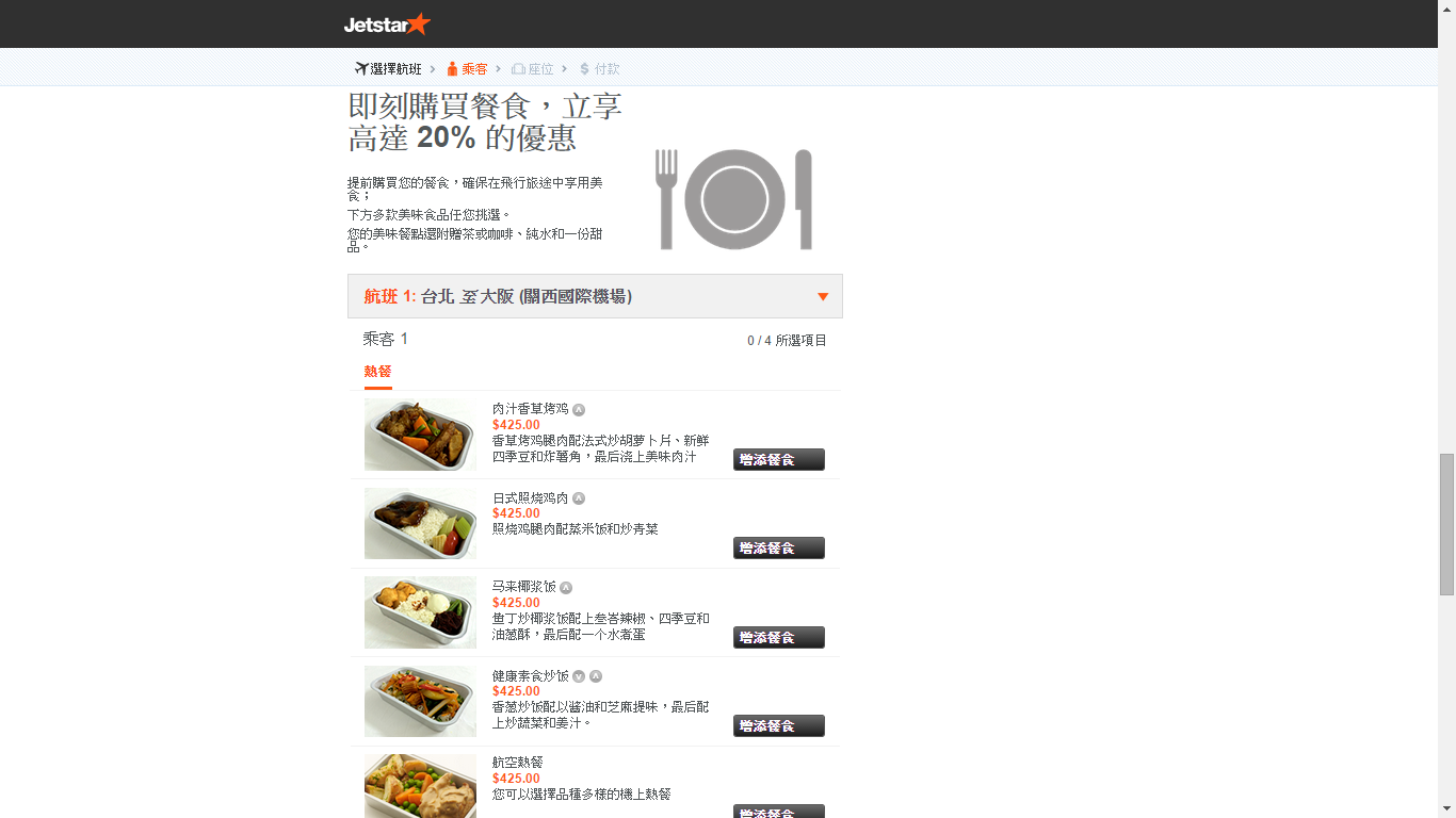 選擇「飛機餐」,有5種口味可以選擇,不過這次航班只有三小時不到就不用再多吃一餐了,實際搭乘時有用餐的旅客也是少數,幾乎都是抓緊時間補眠。