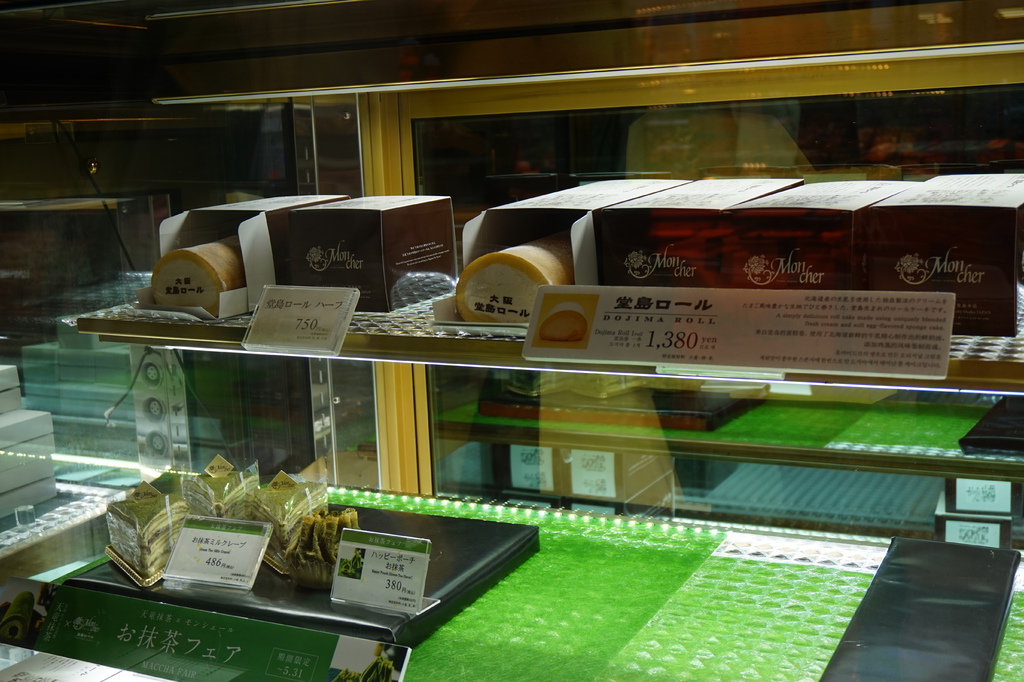 冷藏櫃內只剩堂島ロール、抹茶千層派及抹茶毛巾袋,考慮大條要一次喀完有困難,只先買了半條的堂島ロール;至於抹茶類的布吸引我,先掰掰囉