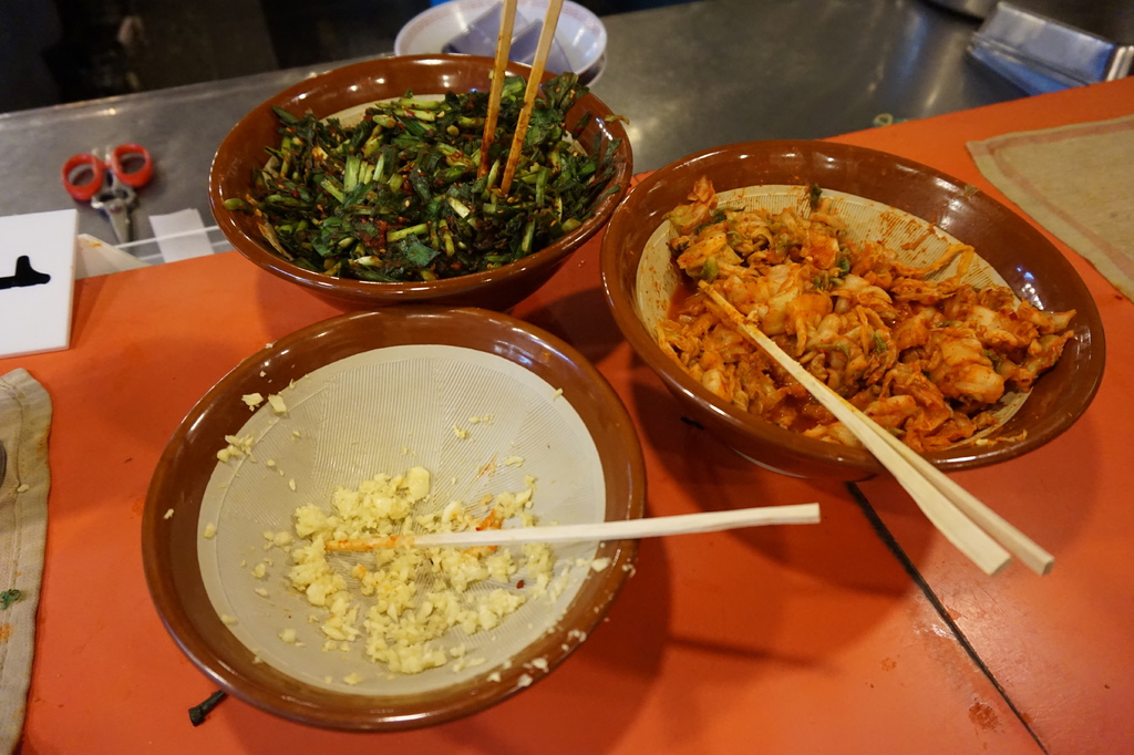 櫃台放有蒜末、辣韭菜跟泡菜可自行加到拉麵裡調味,要把麵端過去加料,不要整碗端走,會把店家嚇一大跳吧?!