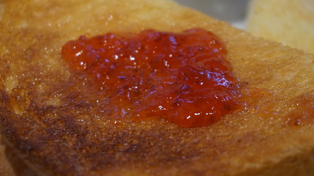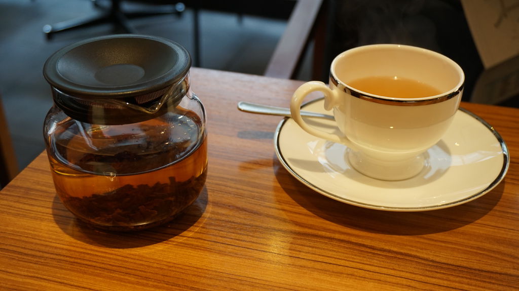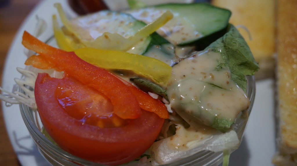 C套餐,擺上來忽然覺得分量有點少,麵包抹上奶油烤成金黃色,附的是很普通的草莓果醬,不過草莓跟奶油原本就絕配,麵包有點硬不是很好咀嚼;沙拉淋上胡麻醬,菜說不上清脆但不會苦苦的就好;飲料點了白桃茶,桃子味蠻香的。