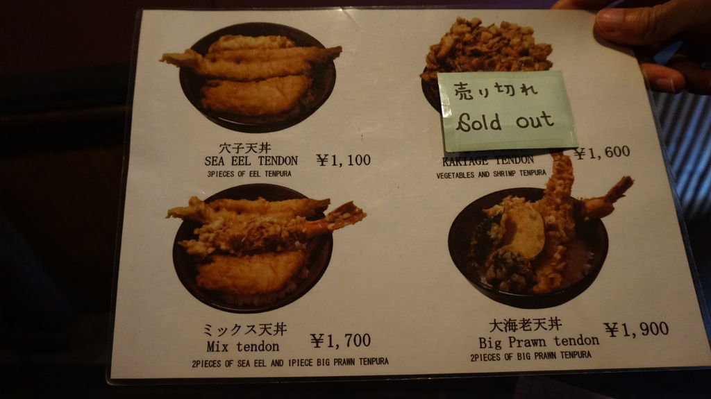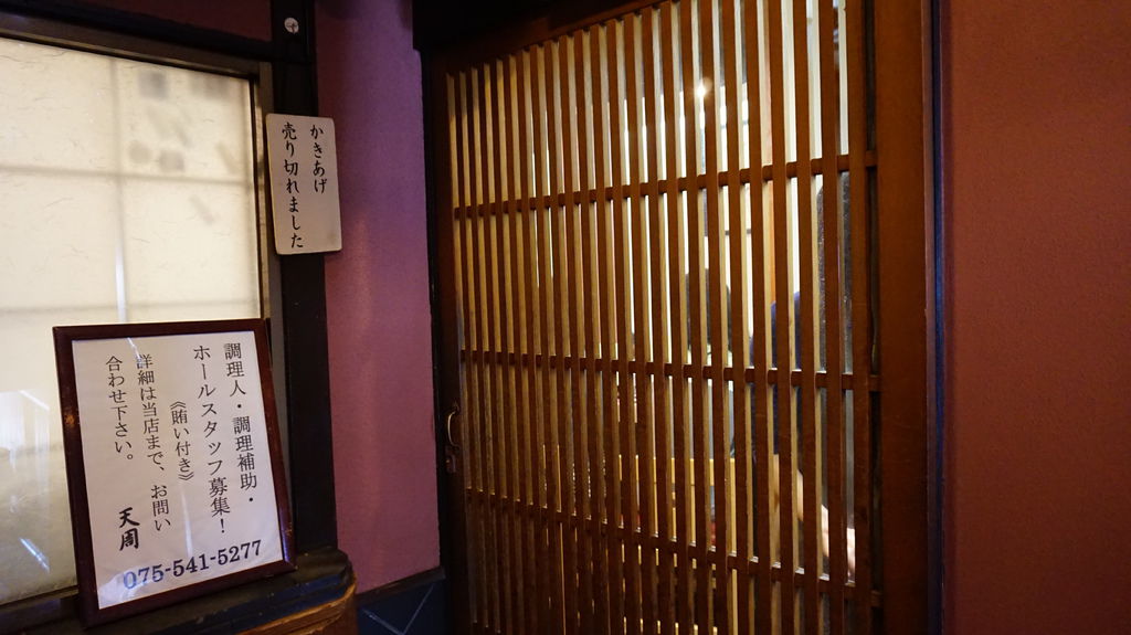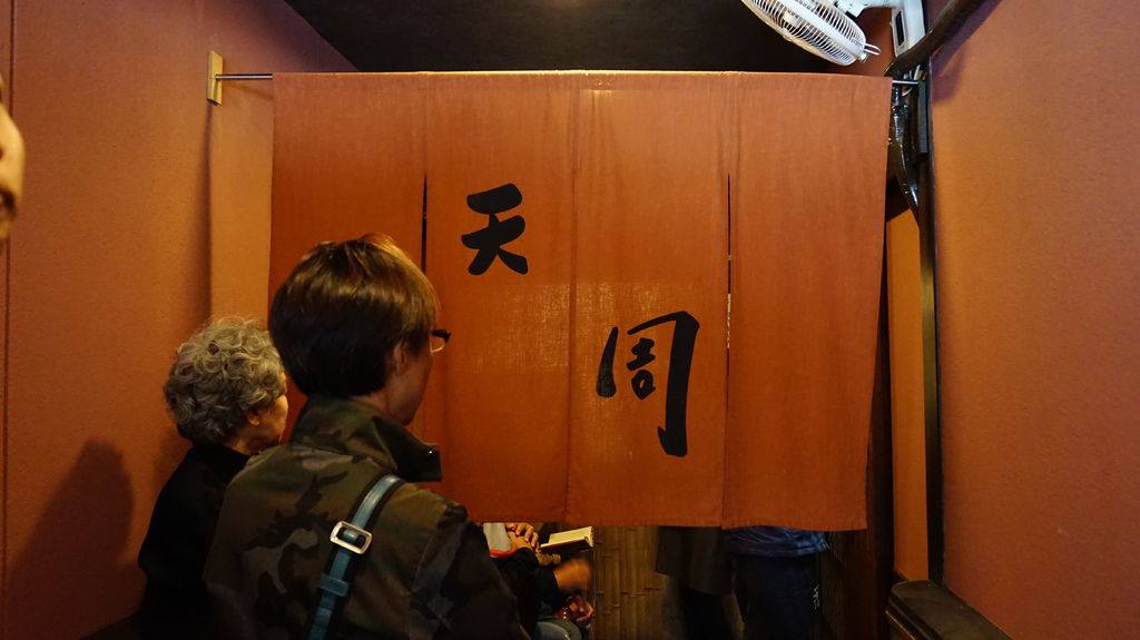 午餐來祉園吃似乎很厲害的天丼,一下公車就馬不停蹄地衝到門口,前面排了七個人不包括已經進店裡的,一站定後面又是一列排隊的人潮,等待期間陣陣香氣不斷從門後方傳來,惹得人心癢癢,只能看著menu過過乾癮。
