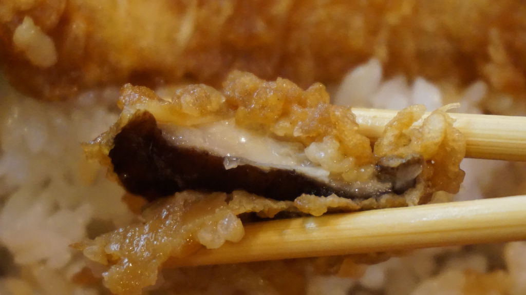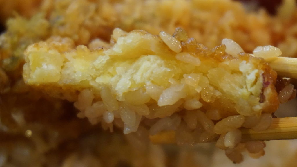 大海老天丼有兩隻大炸蝦、一片紫蘇葉、一塊地瓜跟一朵香菇,炸蝦咬起來會彈牙,雖然麵衣頗厚但完全不會影響口感;地瓜非常鬆軟帶有濃濃的香氣,香菇光看照片就知道有多麼啾希,至於紫蘇葉吃起來沒什麼感覺,很像在吃海苔一碰就碎掉了。
