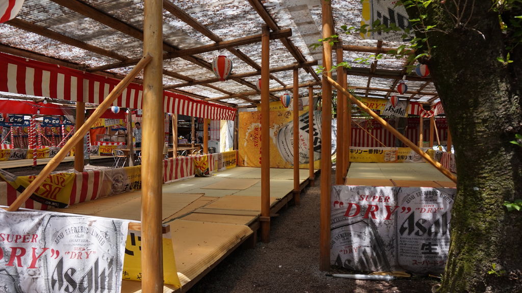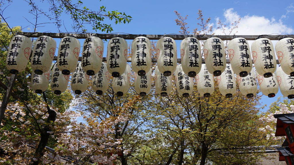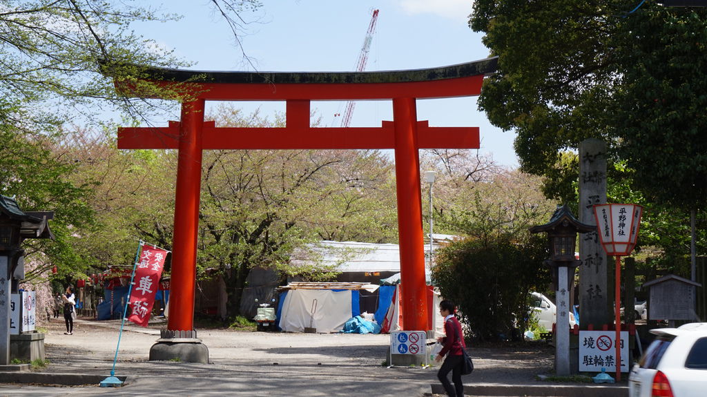拜訪平野神社是從側門進入,到門口被凌亂的擺設嚇了一跳,側門園區搭滿了可供賞櫻的竹蓆,有的區域是露天的什麼都沒有,完~全沒有人,也許到晚上才會出現熱鬧的光景吧。
