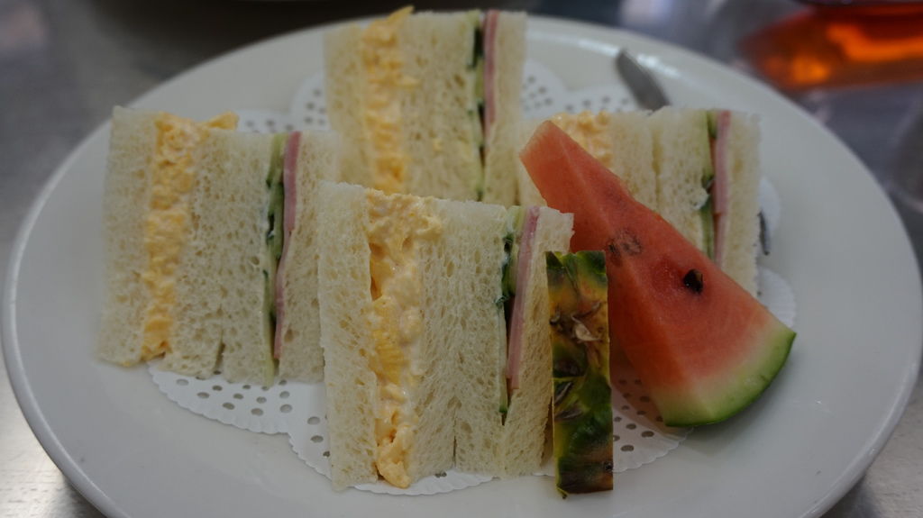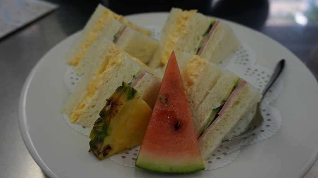 隨便點的三明治,送上來是火腿基本款,吐司鬆軟,蛋很嫩帶有濕潤感,以火腿三明治而言我認為表現蠻出色的,而且份量頗大;附了一片西瓜跟鳳梨,吃起來很清脆,但甜度遠不及在台灣吃到的。