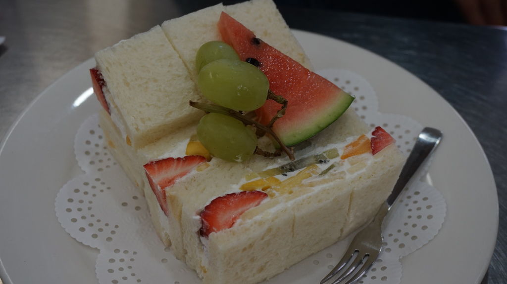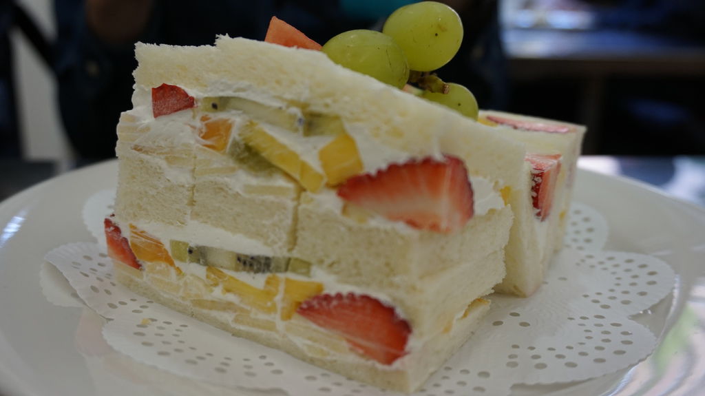 主角水果三明治,內層夾了草莓、奇異果跟水蜜桃,超奢侈的享受;每塊三明治又切成三等份,剛好一口一個的大小,水果本來就帶有水分,再加上美奶滋,口感非常滑順,日本的美乃滋都意外的很清爽,吃多也不會油膩。