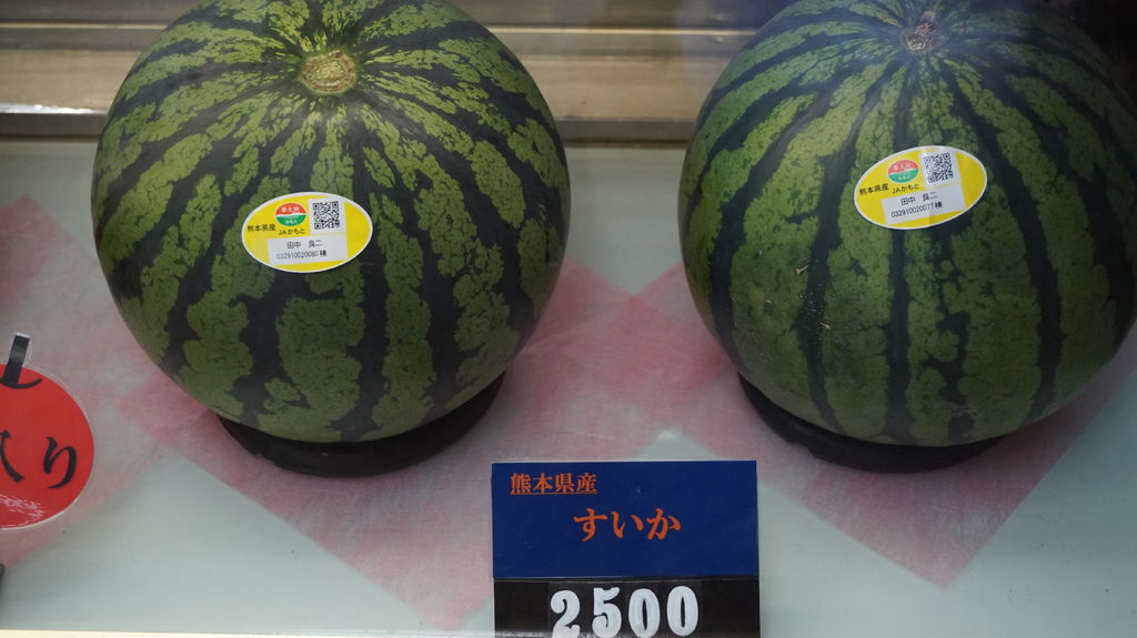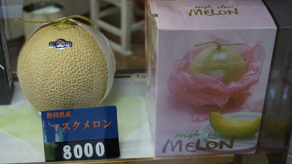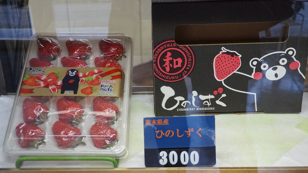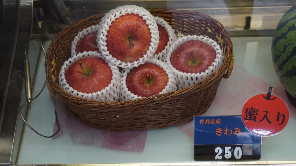 直接到櫃台點餐,展示櫃裡擺著日本各地的水果,不過都不便宜,日本人最愛的哈密瓜,靜岡出產一顆8000円;印了可愛的熊本熊草莓,一盒要價3000円;就連在台灣常見的西瓜,來自熊本一顆竟然要2500円,折合台幣超過600元,在台灣水果遍地真的要感到知足啊;最後是青森的蜜蘋果一顆250円,突然覺得超便宜,哈哈。