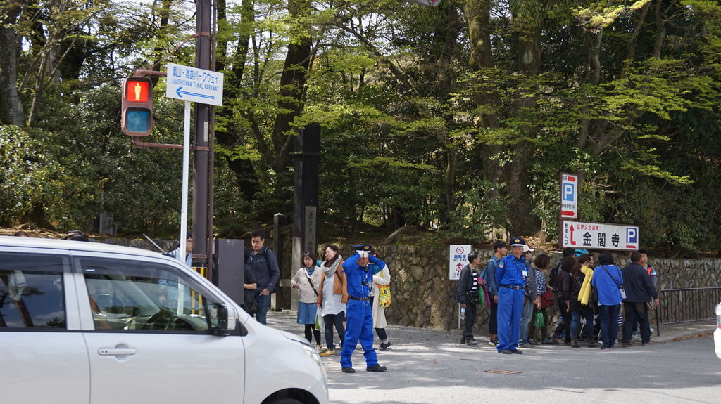 往金閣寺的路程一路上坡,還差點騎到迷路,果然騎腳踏車充滿了考驗,好不容易到了金閣寺山腳下,遠遠就能看到半山腰的左大文字,每逢盂蘭盆會或施餓鬼的活動時會在山上的字跡點火。送火一說代表人體,火焰燒盡隱藏在身體裡的75種煩惱;又說如往黑盆中注滿清水,讓水面映出燃燒中的火文字,喝下之後即可避免疾病上身