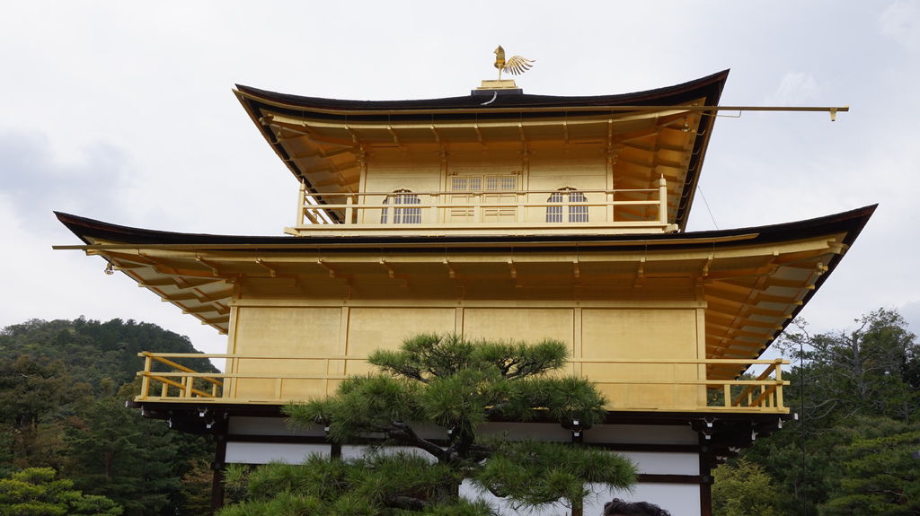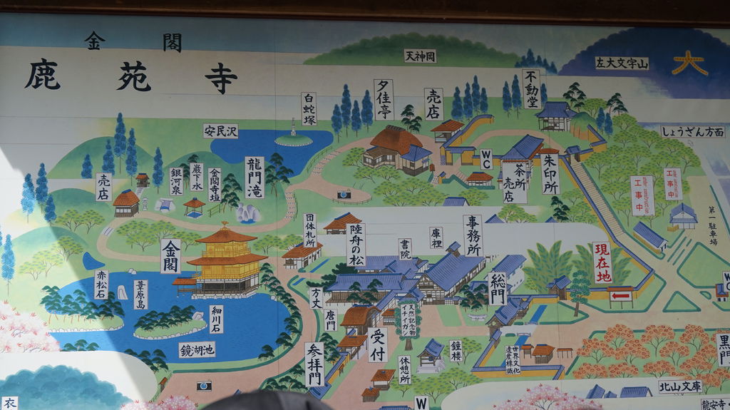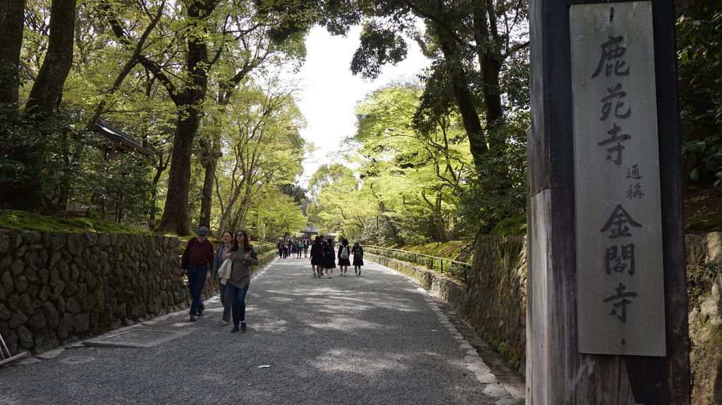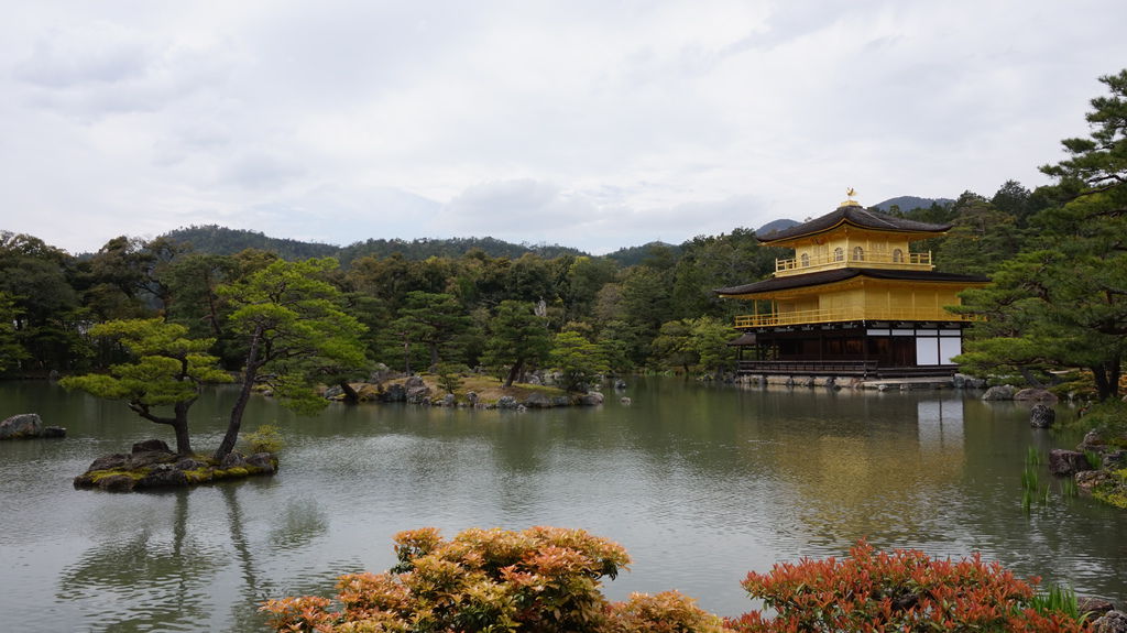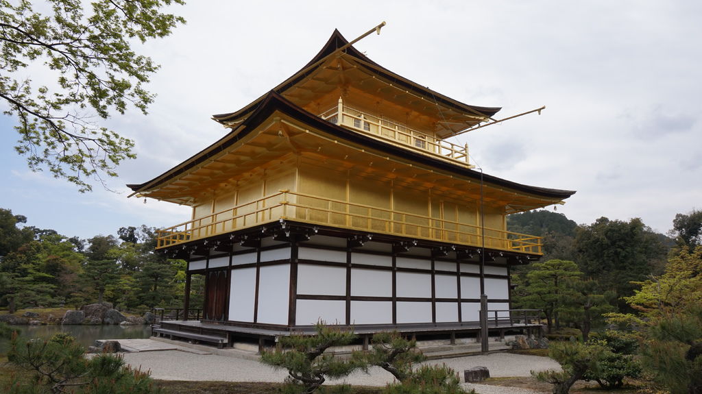 寺內參觀的人非常多,參觀動線順著鏡湖池畔,剛好可以看見金閣寺的全貌,雖然外牆欄杆全貼滿了金箔,但並不顯得俗氣。