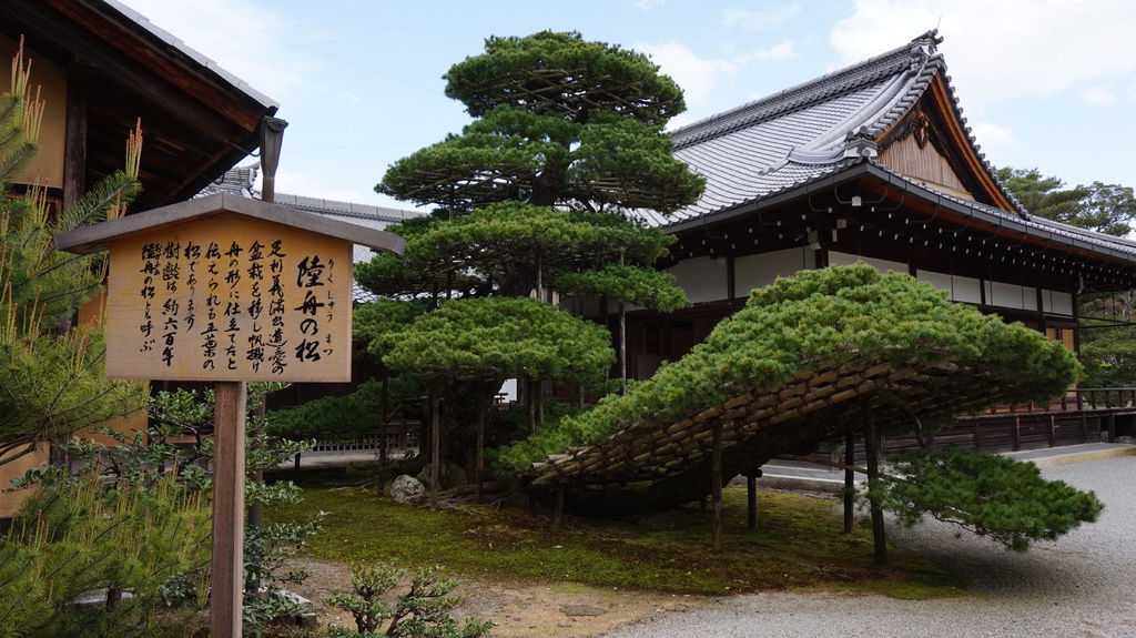 陸舟之松是樹齢大約600年的五葉松,是足利義滿由盆栽移植過來的松樹,修剪成一艘船的模樣。整艘船朝向西邊,以表示想要坐這艘船到西方浄土。