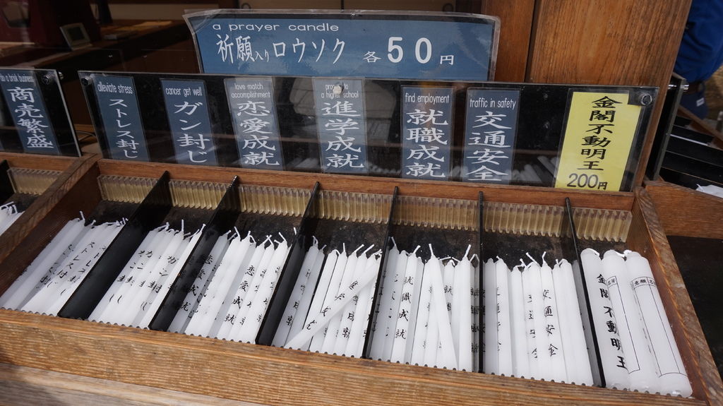 不動堂前設有祈福用的蠟燭,款式頗多可以挑自己祈求的項目點燃蠟燭,看著搖曳的燈火讓人心情感到平靜。