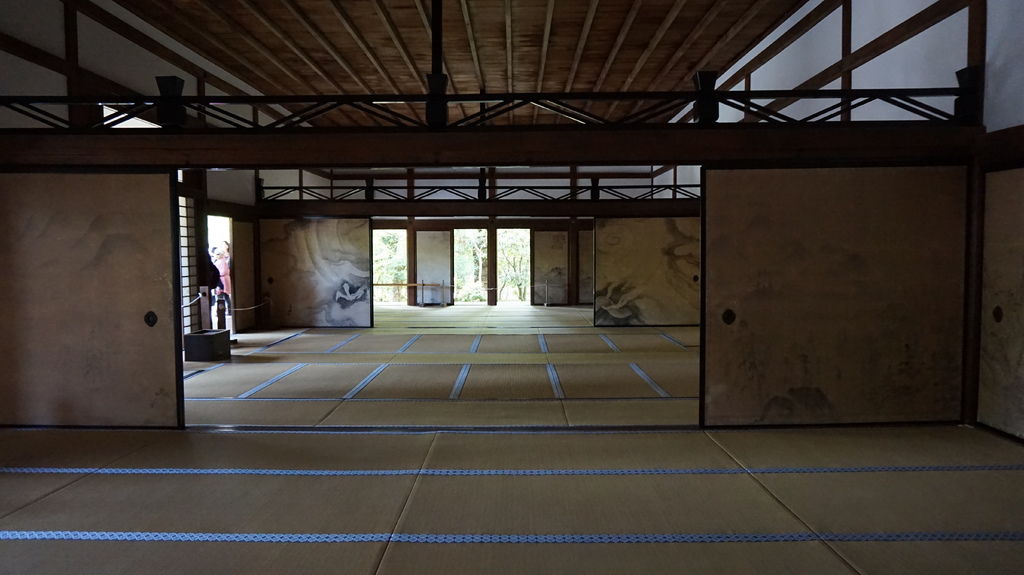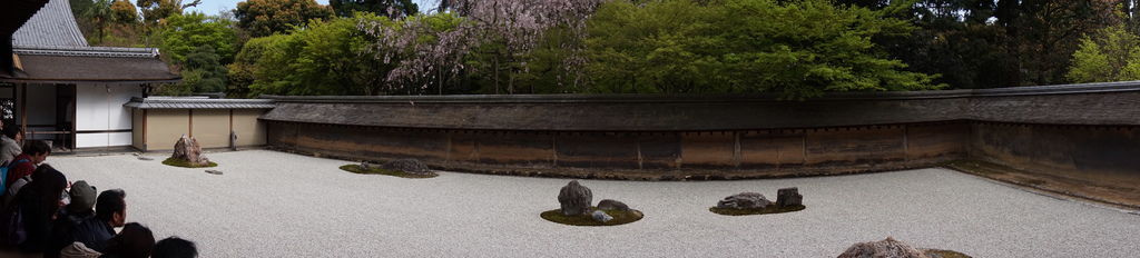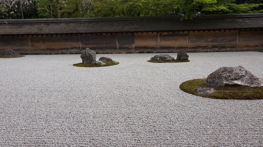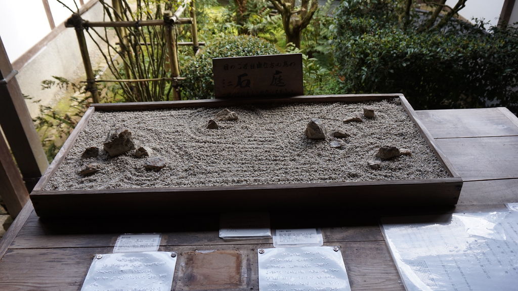 石庭位在主殿裡面,進玄關鞋櫃旁有小小的石庭模型,石庭長30公尺、寬10公尺,由十五顆石頭、白沙及土牆構成的枯山水。以「刻印、作庭、遠近、土塀」四個謎點著稱,可惜我資質駑鈍什麼也看不出來,有興趣的可以去下面的網頁看看。