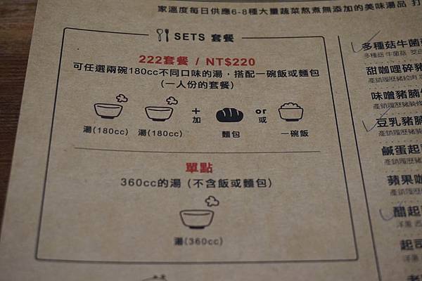 等待時先拿menu過乾癮,跟外面的沒啥兩樣,會把今日例湯勾出來方便選擇,湯品直接點是180cc的份量,估量飢餓指數還有香味大軍從旁鼓譟,直接決定升格為SETS。