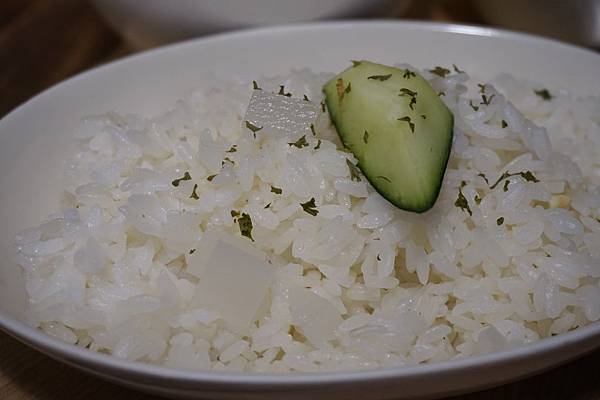 雖說是蔬菜炊飯...上頭放了一塊黃瓜跟幾許白蘿蔔丁,白飯粒粒分明很有嚼勁,不過原以為炊飯是指有調味過的飯,結果只是"白飯"稍稍失望了。