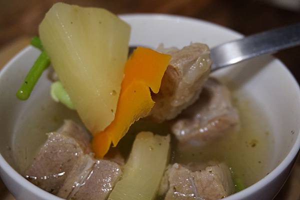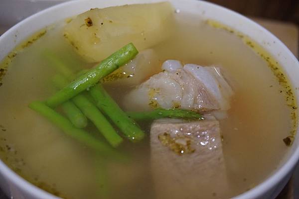 鳳梨苦瓜軟骨湯 → 豬高湯打底,苦瓜的味道淡淡的,吞下去後喉嚨裡才有一絲絲苦味浮上來,單喝湯可以接受直接吃苦瓜pass;除了看到鳳梨載沉載浮外沒什麼鳳梨的味道,反而蘆筍的味道還比較重;豬軟骨超嫩的好好吃,要不是還有牙套的限制,一定吃得連骨頭都不剩。