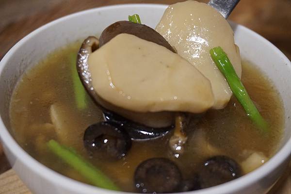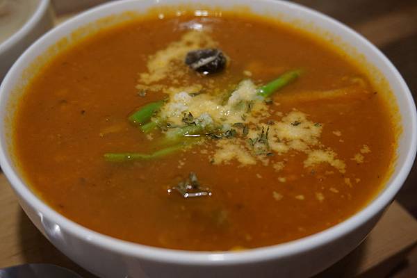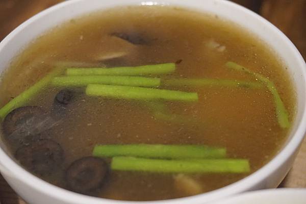 多種菇牛菌菇湯 → 充滿了一堆菇菇,牛菌菇、香菇、杏鮑菇、筊白筍、黑橄欖??咦咦,吃了一口才發現不是菇類,土雞高湯當底,菇菇鮮嫩又多汁,吃起來像雞肉,不過蘆筍味道依舊一枝獨秀。