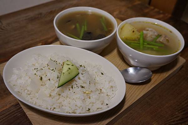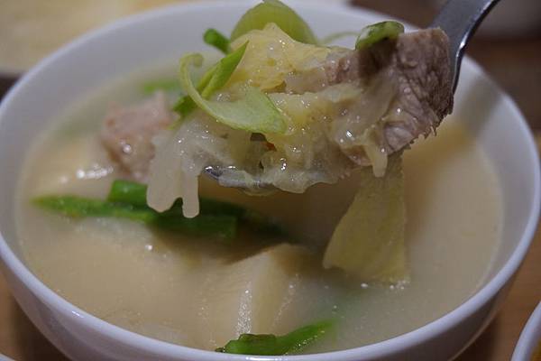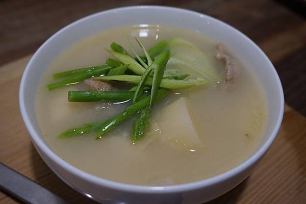 豆乳豬腩條肉清湯 → 豬高湯打底,加了豬腩條肉、大白菜、白蘿蔔、青蒜跟蘆筍,應該是加豆乳的關係湯呈現白濁的顏色,不過喝起來還算清爽,肉一樣很嫩,白菜跟蘿蔔都燉到軟爛很好入口。