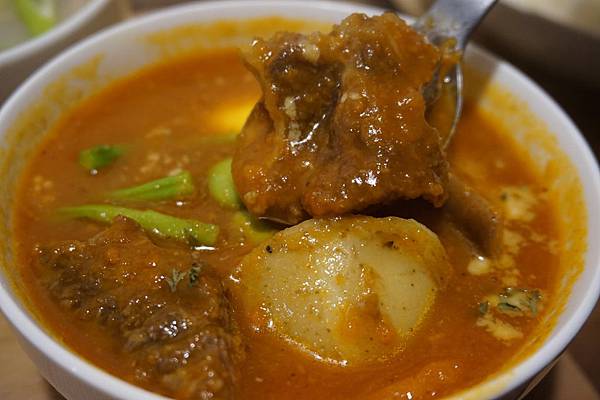 牛肋條燉湯 → 牛肉高湯加入大量蔬菜、牛肋條、番茄燉煮,味道非常非常濃郁,是今天最重口味的一道,跟麵包超搭;牛肋條入口即化,即使是牙口不好的我吃起來也毫無困難。