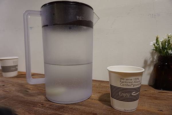 店內是狹長型,約可容納25人左右,安排的位置是面對牆壁的吧檯式座位,桌面有點窄,如果椅子下能多個籃子放包包跟外套我想會舒適很多。桌邊放有溫水可自由取用,裡面加了柳橙片,帶了果香很好喝。