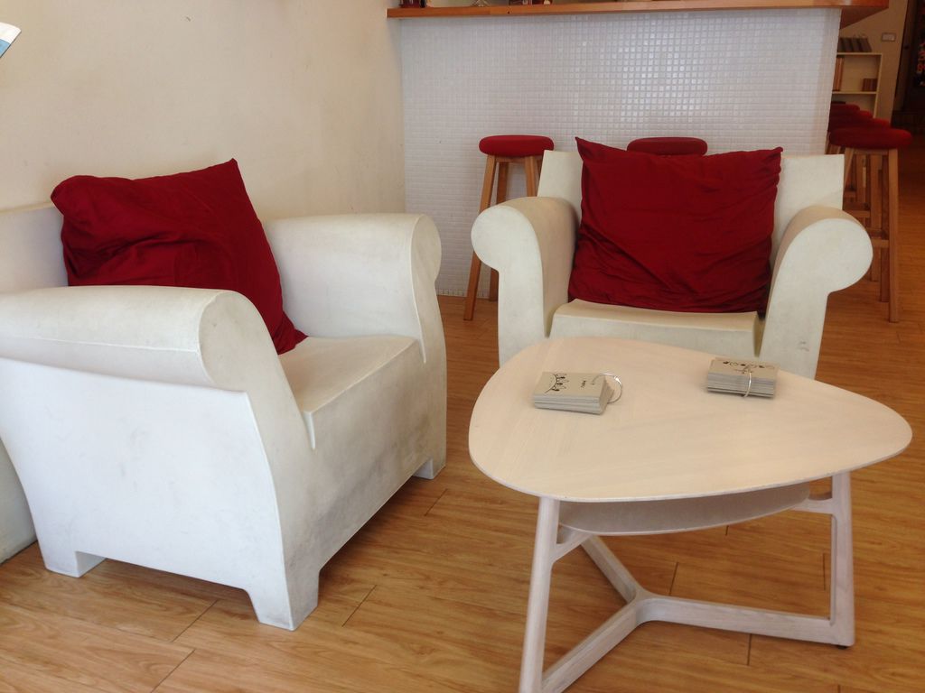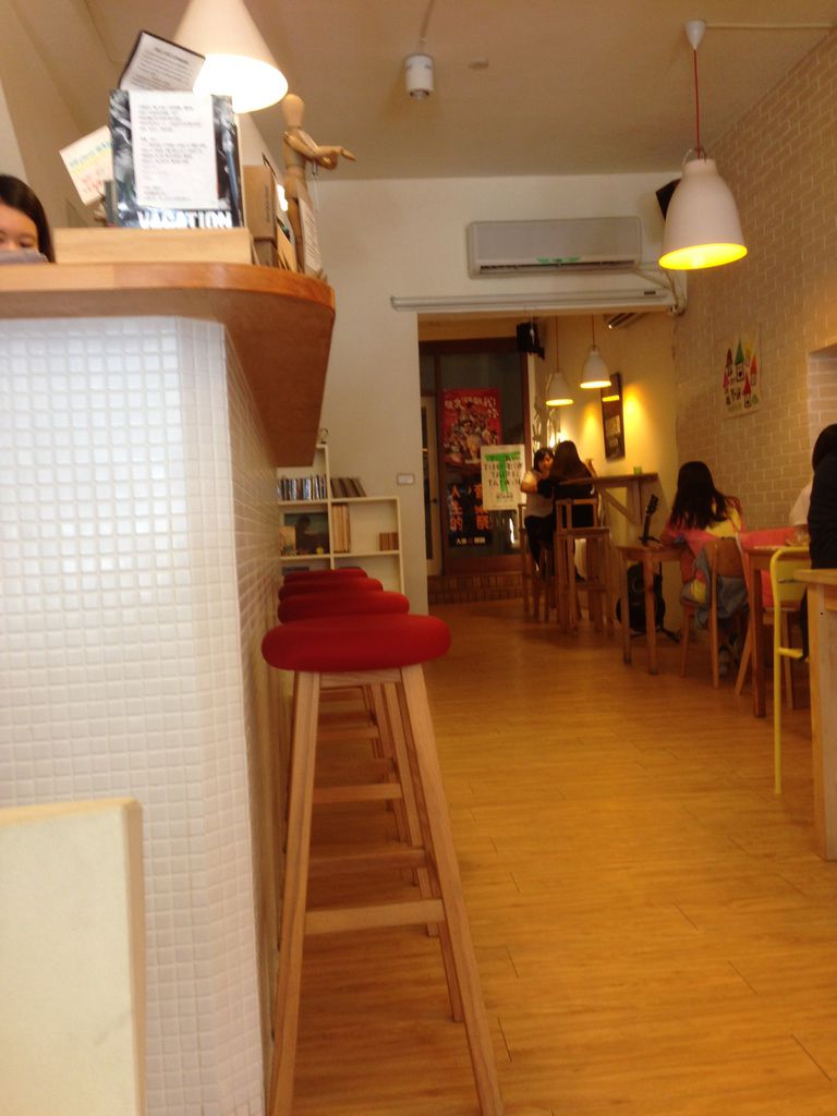 安排的位置就在落地窗前的偽沙發區,看起來軟軟的椅子其實是塑膠啊...坐下去的瞬間嚇了一大跳。其他的多是高腳椅,或是吧檯座,店內空間很深,可以容納30人左右。