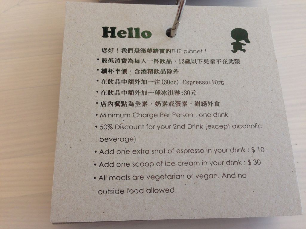 花蓮的學妹翻越半個台灣來找我喝下午茶,時間喬了好久總算是湊到了一塊兒,配合學妹吃素的習慣,意外找到好好吃的蔬食簡餐店。The Planet 以素食餐點為主,低消是一杯飲料,而且還可以帶寵物耶,也太友善了,不過消費當天是沒見到有人帶啦。